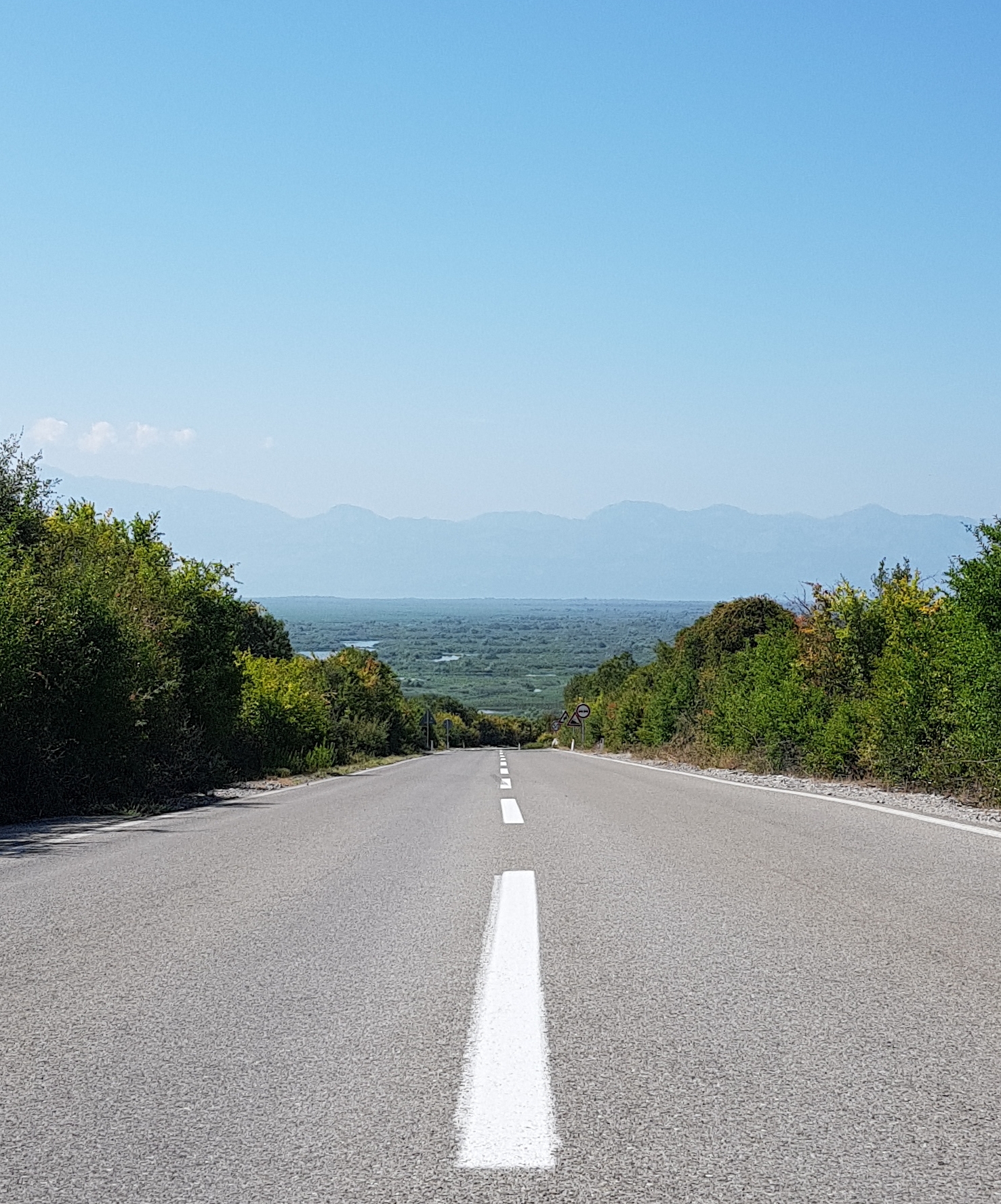 The road out of Podgorica is flat and hot to begin with, before it starts to climb through Mediterranean type scrub on its way up to the border. I’m now cycling above an inlet of the gigantic Lake Shkodër and, looking back, I can see its vast wetlands stretching away for miles into the distance. I’ve been slogging up this hill very slowly and gently, in an effort to preserve my warped rear wheel. All this restraint goes out the window though on a fast, steep descent to the border post. I’m such a sucker for a speedy downhill, despite the potential consequences.