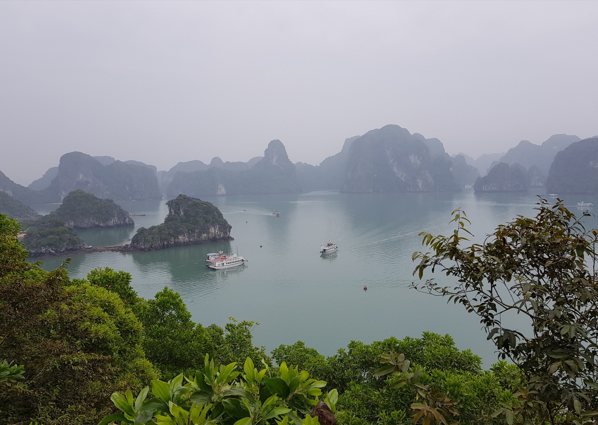 At Ha Long Bay the boat jetty is utter pandemonium. I knew it would be busy, but the sheer volume of tourists is mind-boggling. Three minibuses worth of people are crammed onto our boat. We chug out into a calm, silvery sea and make towards the islands. I’d seen pictures of the bay before which show dark green islands, dotted in an emerald sea under a sunny blue sky. Today, though, the colours have been muted under a humid, cloudy blanket, giving the place a more moody and atmospheric feel.