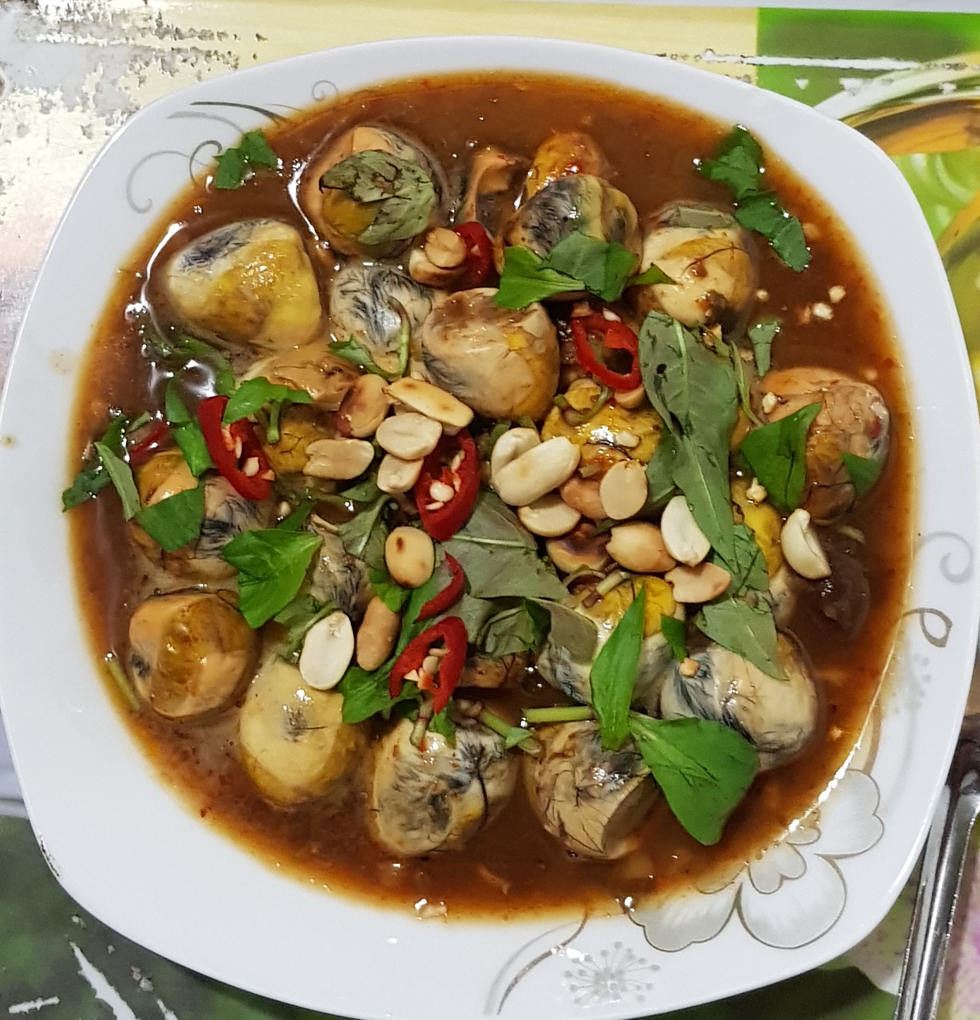 When my food arrives I’m not quite sure what to make of it ! I’m given a bowl of what looks like a light brown curry sauce topped with chillies, peanuts and coriander. It’s the ‘protein’ part of the meal that is a worry. In amongst the sauce there are about twenty small, oval-shaped morsels, mostly an off-white, yellowy colour, but with darker circles in their midst. Jesus, are they eyeballs ? Or could they even be testicles ? They are certainly the correct size and shape ! I prod them around a bit and have a closer look before finally working out what they are. I’m pretty sure they look similar to the fertilised duck egg I tried in Hanoi, only on a smaller scale. They have to be fertilised quail’s eggs. Don’t they ?