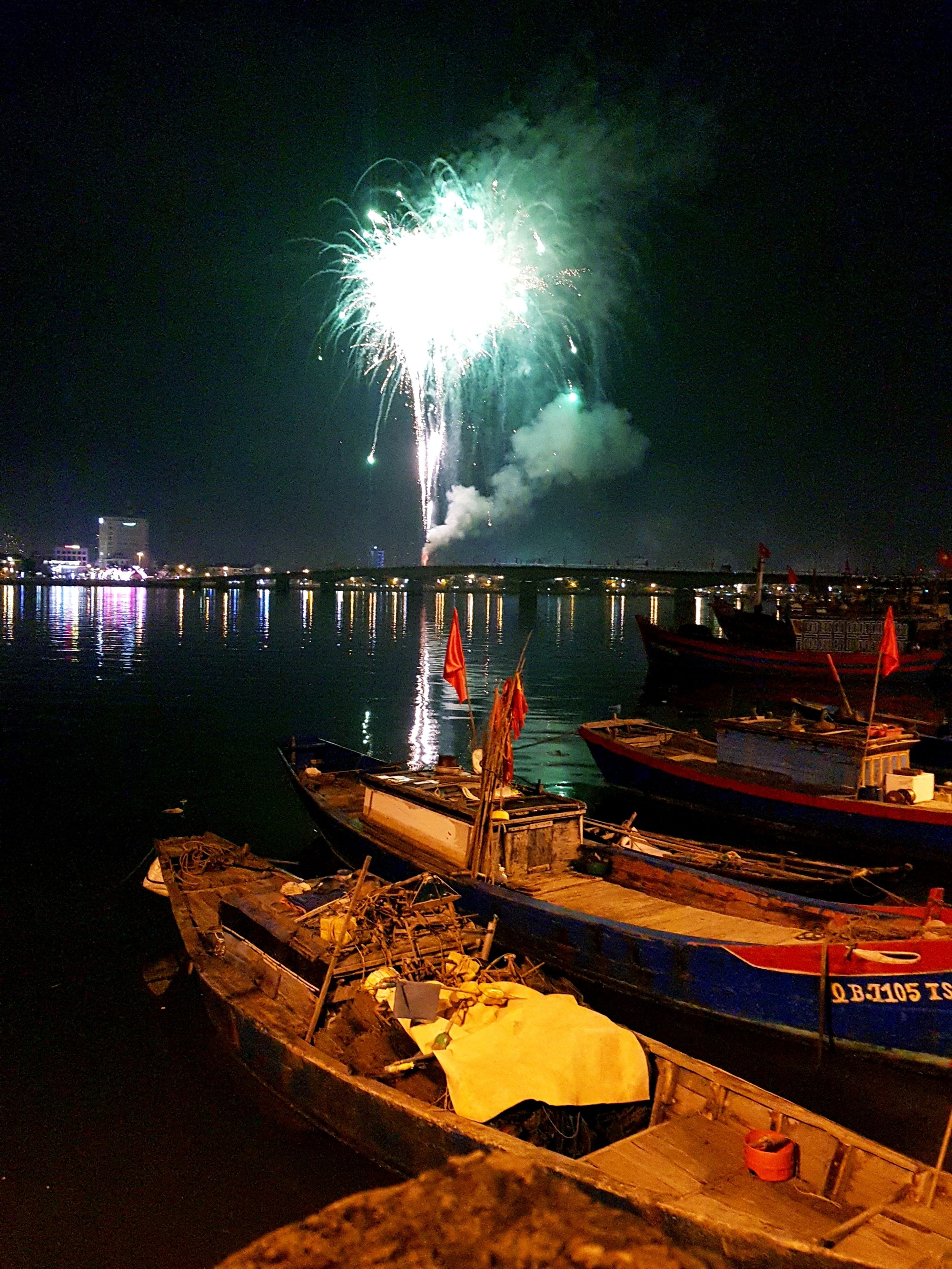 At midnight fireworks start shooting up from the main bridge over the river, with greens, reds and yellows being reflected in the dark waters and over traditional wooden fishing boats. At one point during the display I hear a deafening screech behind us, before a piercingly loud rocket screams past our heads and bounces on the river in front. Bloody Hell, that was close ! We all step back from the river and move across the street so we are safely covered by buildings for the rest of the display. Twenty minutes later the official fireworks are over, but the city’s residents are keen to carry on celebrating. There are bangs, flashes and explosions all around us, including a bunch of firecrackers thrown from a first floor balcony into the lane we are walking along. The place sounds like a war zone.