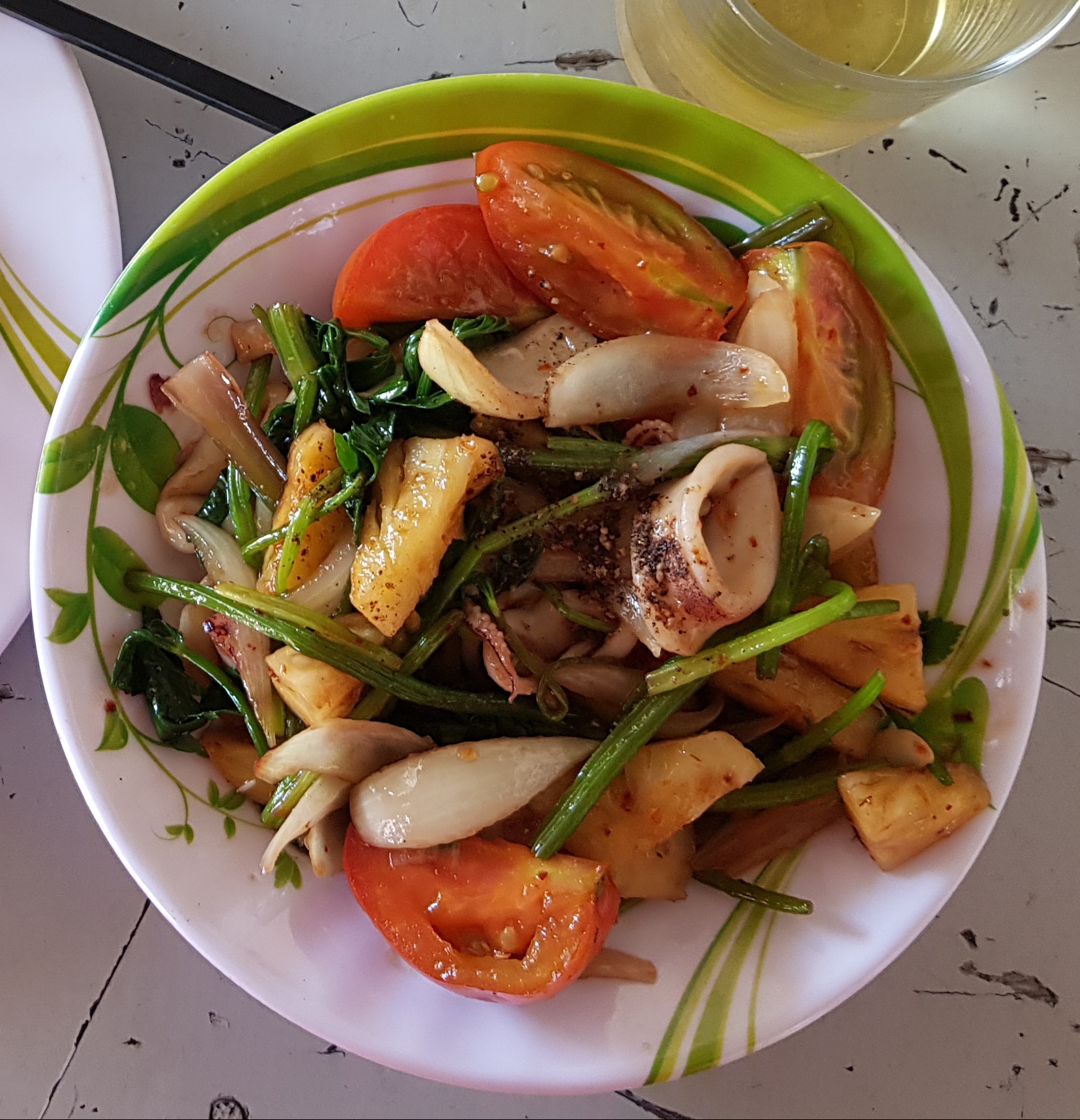 Considering the state I was in a couple of days ago, I wake up this morning with my insides feeling quite settled. Even my morning crap is a bit more solid today, despite its grotesque, yellow baby poo colour. Breakfast is the usual yoghurt, ‘froosh’ and cereal option, before I finally get all my gear together for an 11.00am departure. I say Goodbye to the hotel’s long term residents and their peculiar brand of semi-alcoholic, expat lifestyle. They all seem happy enough, but I don’t think it’s the life for me. Even with no money worries, I’d find it too boring to be stuck in the one place just getting drunk most nights. When I do leave, I only trundle as far as Madame Trinh’s restaurant for some lunch, where I have my prawns, veggies and rice combo, washed down by a fresh papaya milkshake.