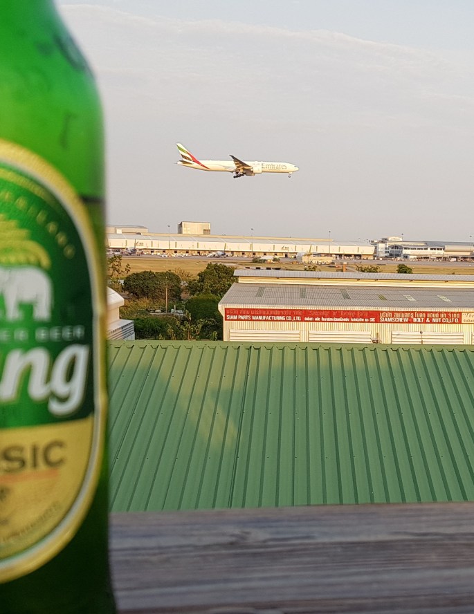 To celebrate my arrival I pop to the 7-11 next door, buy a large Chang Beer and make my way up to the hostel’s roof terrace. I sit there, slowly supping the cold beer while watching a steady procession of planes coming into land on the runway ahead of me. They start as tiny specks in the high distance, way off to my left, before looming larger and touching down just past my vantage point. It’s the perfect spot to relax and mull over the journey I’ve just undertaken.