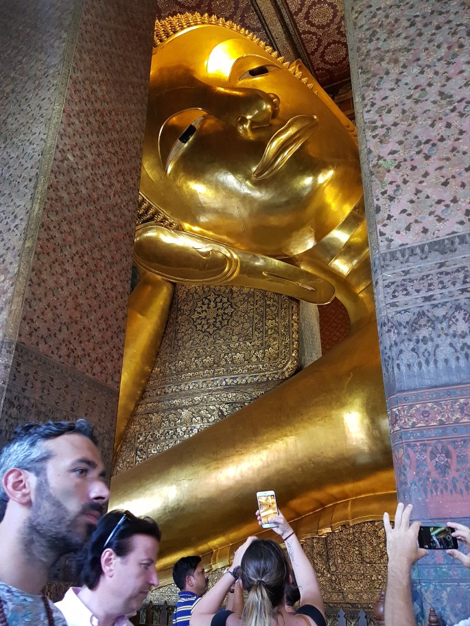 Today I walk to Wat Pho, which is on my side of the river, beside the Grand Palace and a distance of only 2km. I plod along quite slowly mind you, mindful of my guts now as well, on top of everything else. I pay my 200 Baht entry fee and start walking round a large complex full of temples, spires, sculptures and tourists. However, the real drawcard at Wat Pho is the Reclining Buddha, which has an entire temple to itself because it’s so blooming huge.