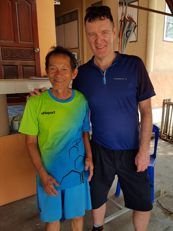 A further five minutes down the road I meet an old French cycle-tourer heading the opposite way. He must be in his sixties and has the furriest ears I’ve ever seen. He also carries a metre long bamboo stick, attached to his bike frame, as protection against dogs. My general tactic now is to stop pedalling and use the Gordon Buchanan ‘Hey, Bear’ approach. It seems to have worked so far, but a bamboo stick would probably be good back-up. The furry Frenchman is heading North to Hua Hin, then getting a ferry across the Gulf of Thailand to the delightful city of Pattaya. Good luck in that shithole mate.